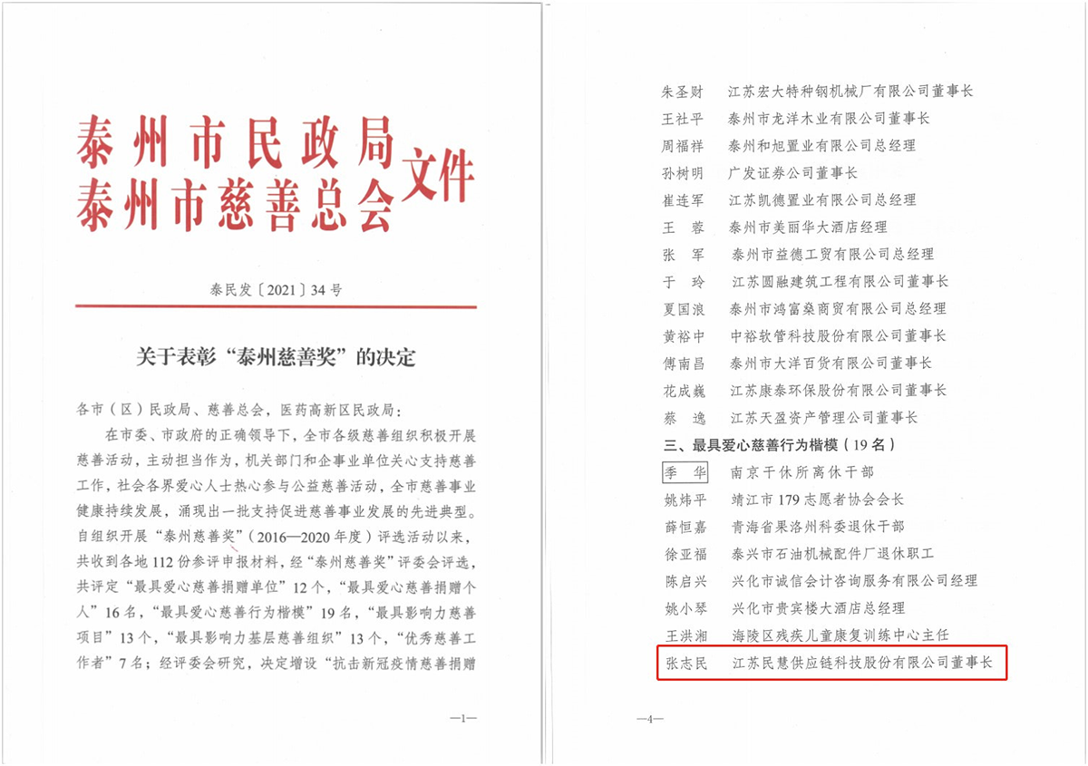 公司董事长张志民获评“泰州市最具爱心慈善行为楷模”